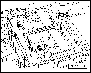 - Connect the ground cable - 1 - to the battery negative terminal and tighten the mounting bolt to the specification shown in => [ Battery Overview ] Battery Overview.