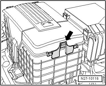 - Open locking mechanism - arrow - and remove battery box cover.