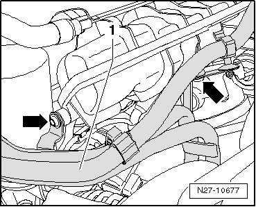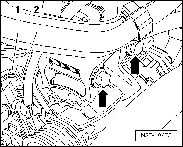 - Remove both screws - arrows - and move the coolant pipes and the hose - 1 - upward so that there is enough space to remove the generator.