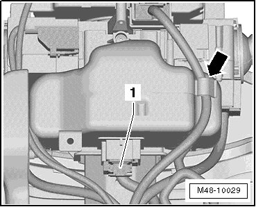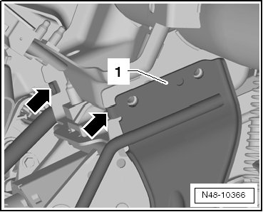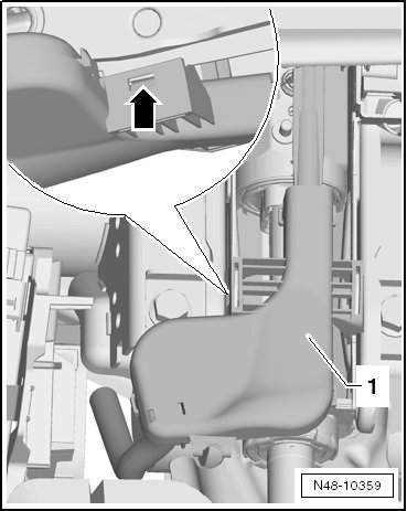 - Press the tabs - arrow - on the cable channel - 1 - inward on both side. Then remove the cable channel - 1 - from the guide on the steering column.