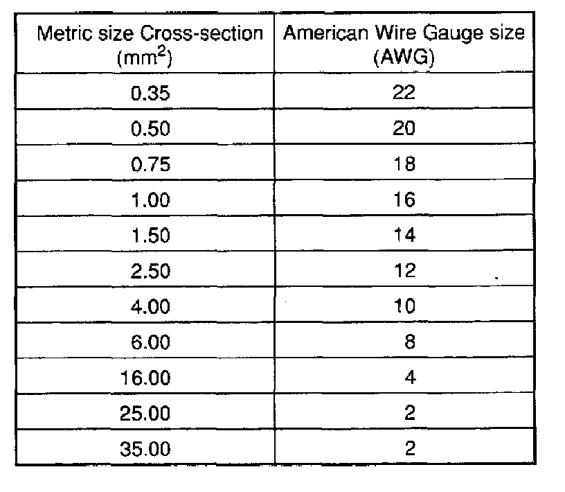 Wiring Diagrams identify wires by the metric wire size. Metric wire sizes indicate cross-sectional area in square millimeter (mm sq.). The chart below lists metric wire sizes and their equivalents in American Wire Gauge (AWG) sizes.