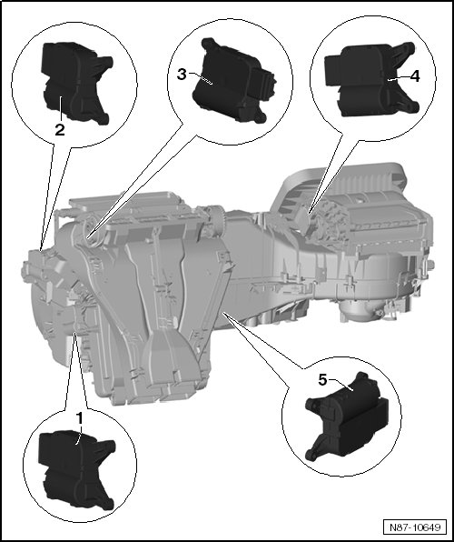 • Removing and installing, refer to => [ Fresh Air/Recirculating Air/Back Pressure Door Motor (V425) ] Fresh Air/Recirculating Air/Back Pressure Door Motor (V425).
