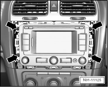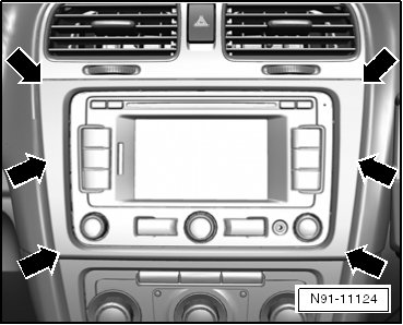 - Remove the radio/radio navigation system screws - arrows -.