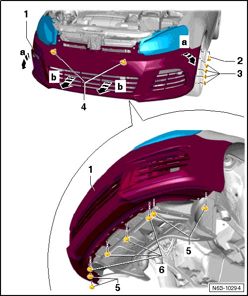 - Install the bolts - 2, 3, 4, 5, and 6 - and tighten them to the tightening specification. Refer to => [ Bumper Cover Overview, Golf R ] Bumper Cover Overview, Golf R.
