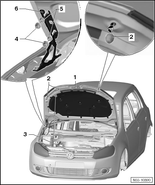 - Loosen the left and right nuts - 5 - on the hinge - 6 - and then align the hood between the fenders. Do not remove the nuts.