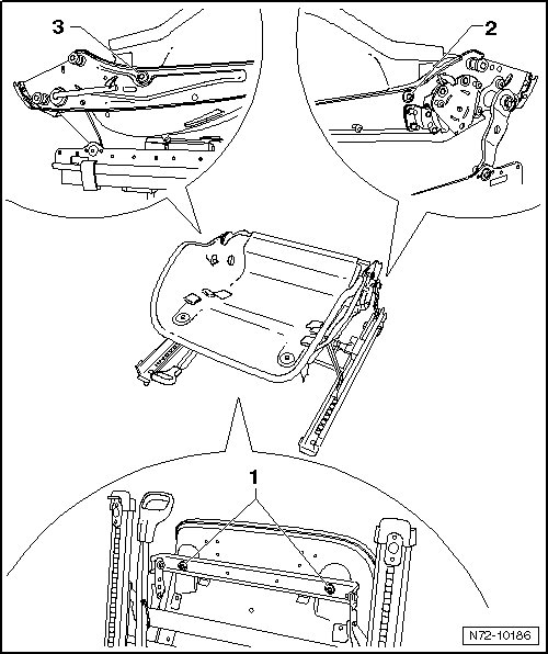 - Remove front bucket seat backrest. Refer to => [ Front bucket seat backrest, removing and installing ] Front bucket seat backrest, removing and installing