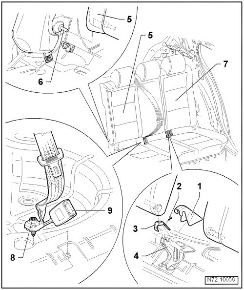 - Remove bolt - 8 - (40 Nm) and remove belt buckle - 9 - from floor.