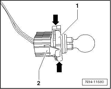 - Press the releases - arrows - and pull the front turn signal bulb - 1 - out of the bulb socket - 2 -.