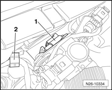 - Disconnect the exhaust gas temperature sensor 3 connector - 1 - (attached behind the bracket).