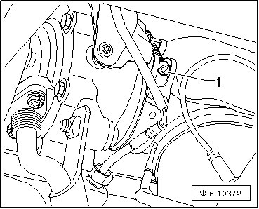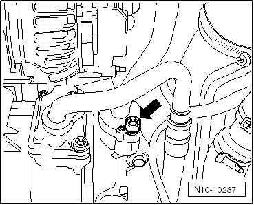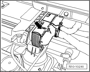 - Remove the bolt - arrow - and move the windshield washer fluid reservoir filler tube to the side.