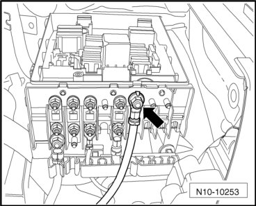 - Remove the nut and starter positive wire - arrow - from the central electronics and place the wire on the engine.