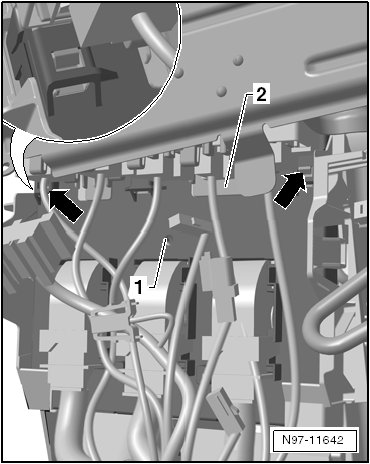 - Open both tabs - arrows - and pull the relay carrier - 2 - from the vehicle electrical system control module - 1 - opposite the drive direction.