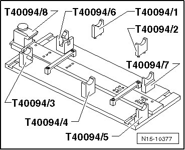 - Remove the camshafts with the bearing frame and the camshaft fitting tool (T40095) from the camshaft fitting tool (T40094).