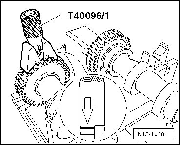 - Mount the component of T40096 (T40096/1) on the toothed gears of the exhaust camshaft.