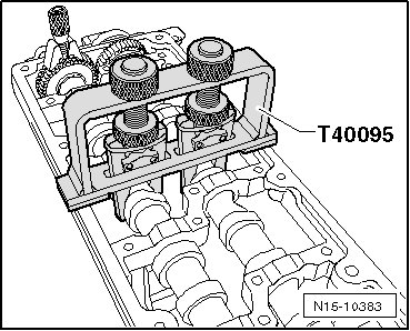 - Position the camshaft fitting tool (T40095) as illustrated and secure the camshafts in the bearing frame.