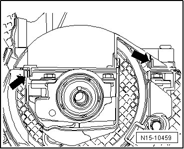 - Press the toothed belt guard in the area with the clips - arrows - against the cylinder head cover until the clips engage with each other. Use a screwdriver to press the guard if necessary.