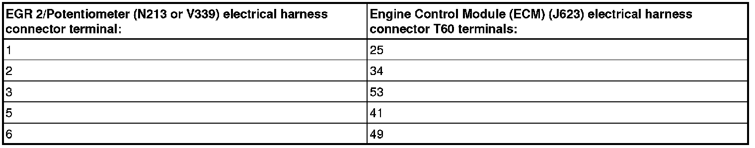 - Using a multimeter, check the EGR 2/Potentiometer (N213 or V339) electrical harness connector terminal to the Engine Control Module (ECM) (J623) electrical harness connector T60 terminal for resistance. Refer to Wiring Diagrams for Pin locations.