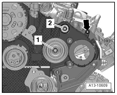 - Remove the idler rollers - 1 and 2 - and remove the bolt - arrow - for the toothed belt guard.