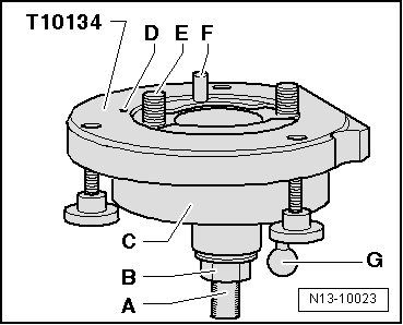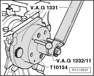 - Tighten the nut on the assembly tool (T10134) to 35 Nm using the torque wrench (5-50 Nm) (V.A.G 1331) and the tool insert AF 24 (V.A.G 1332/11).