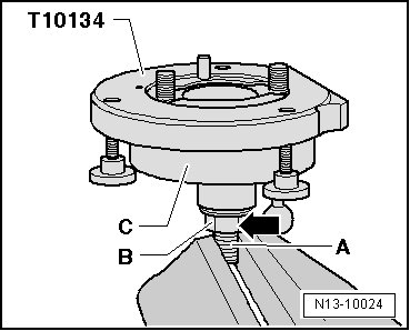 - Push the threaded spindle on the assembly tool (T10134) in the - direction of the arrow - until the nut - B - rests on the assembly bell - A -.