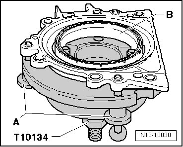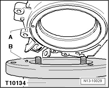 - While tightening the knurled bolts - A -, press the sealing flange and sealing lip support ring - B - onto the surface of the assembly tool (T10134) so that the locating pin can no longer slip out of the bore of the sensor wheel.