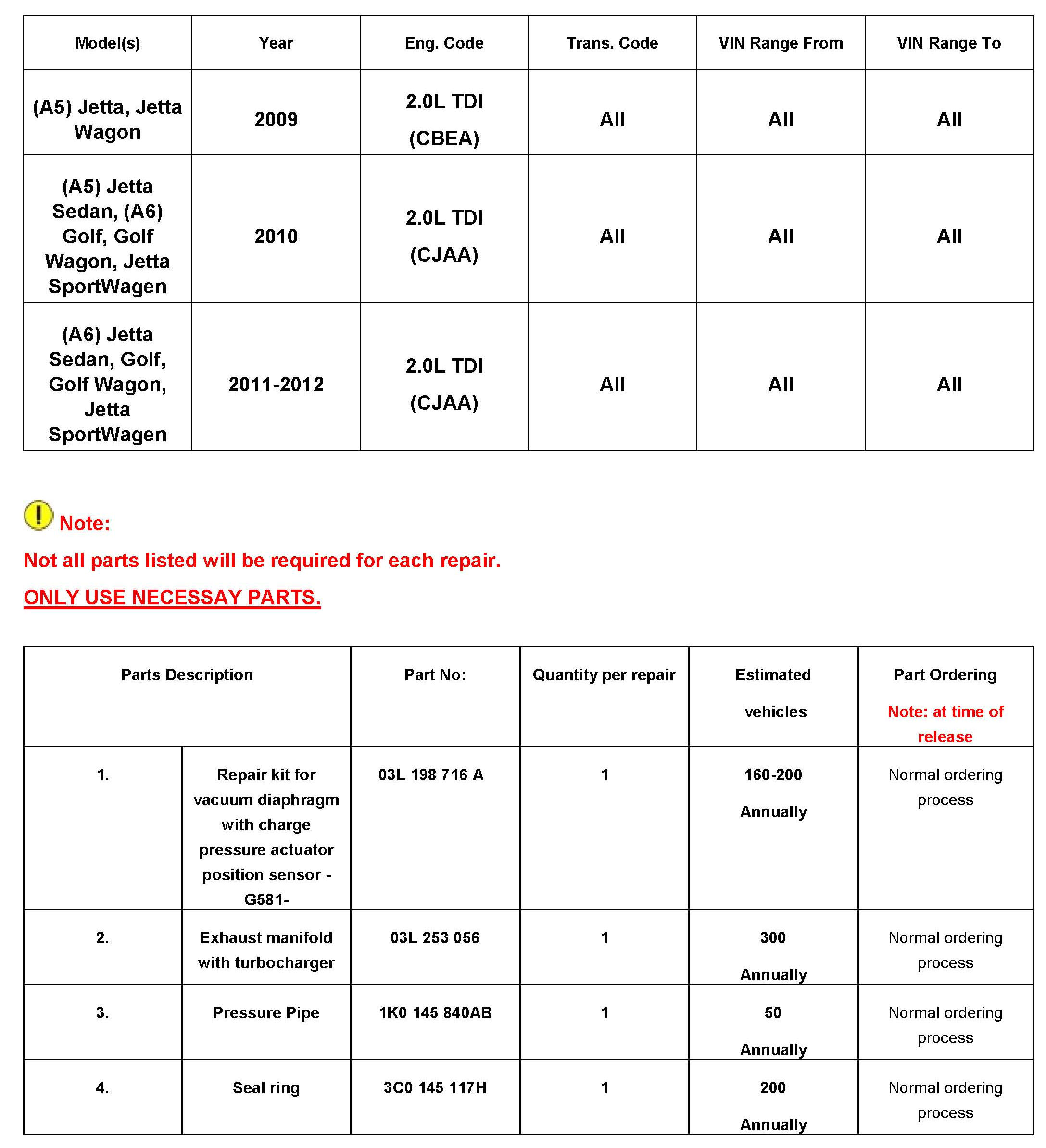 Always check with your Parts Dept. and Repair Manuals for the latest information.