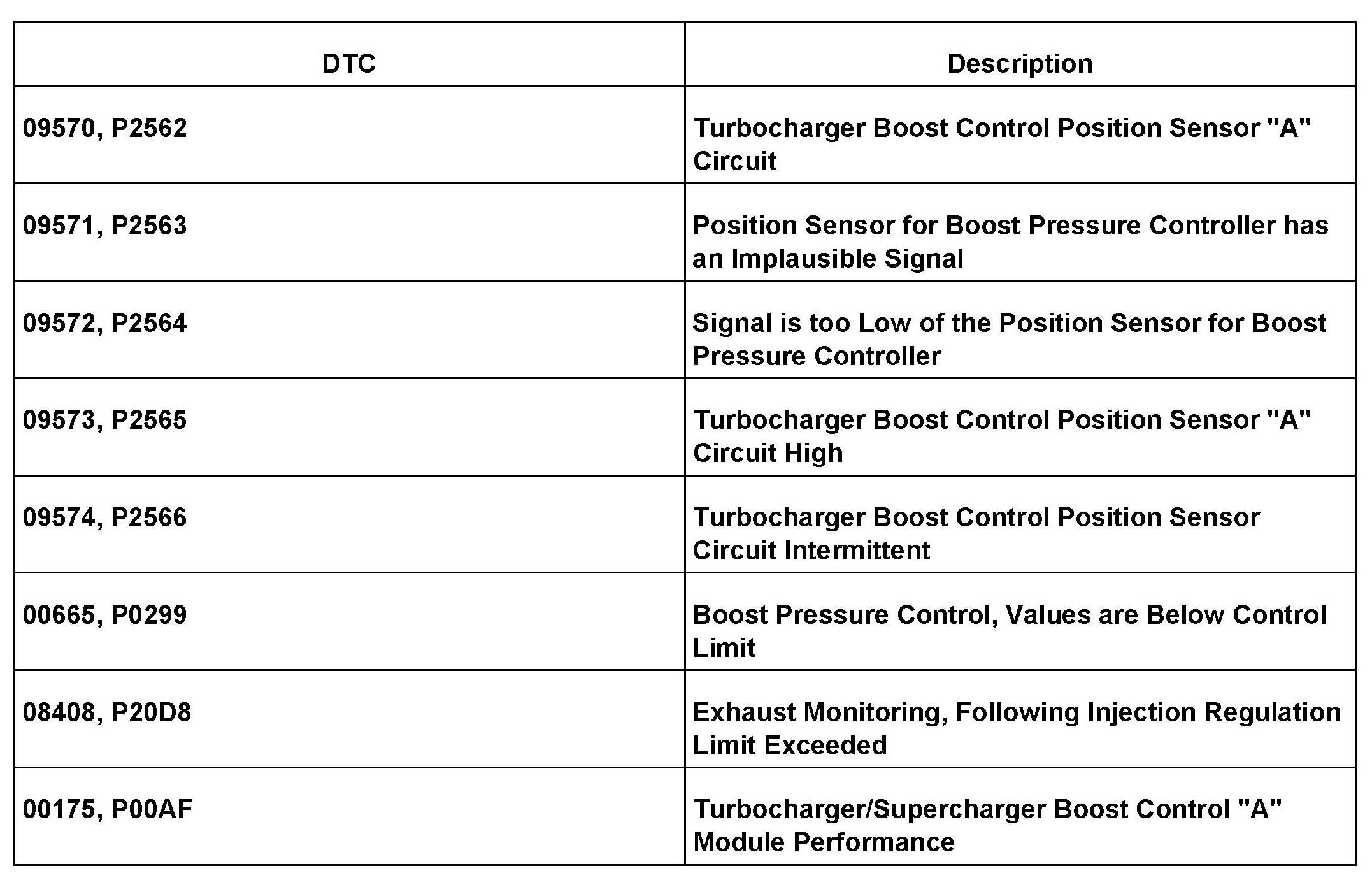 Engine Lacks Performance, Engine Warning Light ON, DTCs P2563, P2564, P0299 or P20D8 Stored in ECM