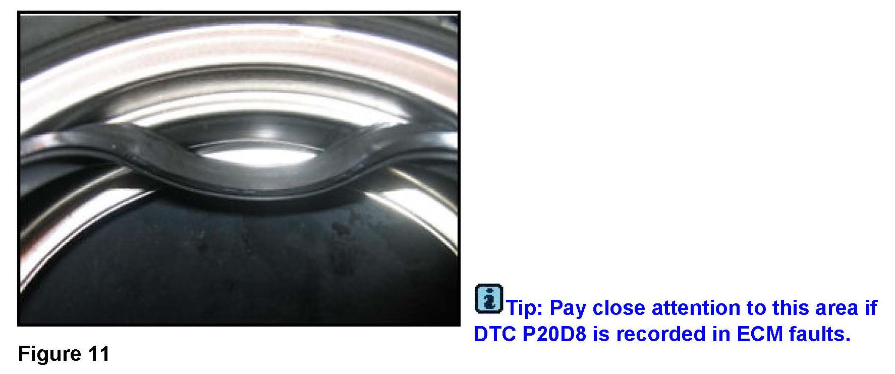 ^ Carefully inspect the turbocharger housing around the entire housing assembly for an alignment mark (Figure 7). If the alignment mark is misaligned, this indicates that the housing has rotated.