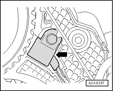 - Turn the tensioner roller eccentric pulley using the socket wrench (T10264) counterclockwise - arrow -, until the locking tool (T10265) can lock the tensioner.