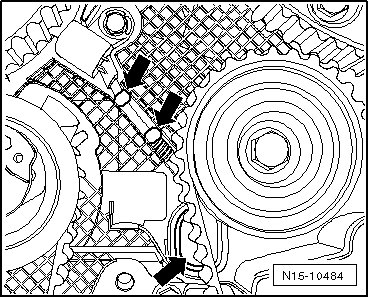 - Rotate the engine to Top Dead Center (TDC) and secure the crankshaft toothed belt gear using the crankshaft stop (T10050). Push the crankshaft stop from the front side of the toothed belt gear into the teeth. The toothed segment of the camshaft gear must be in the "12 o'clock" position.