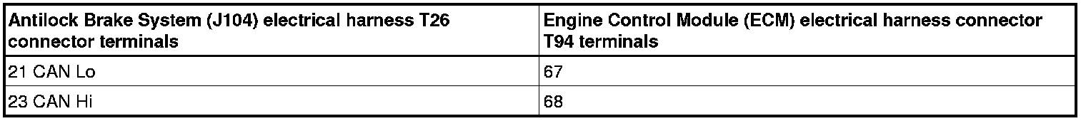 - Using a multimeter, measure the resistance between the CAN bus low and CAN bus high at the Antilock Brake System (J104) harness connector (with ALL other modules connected). Refer to Wiring Diagrams for Pin locations.
