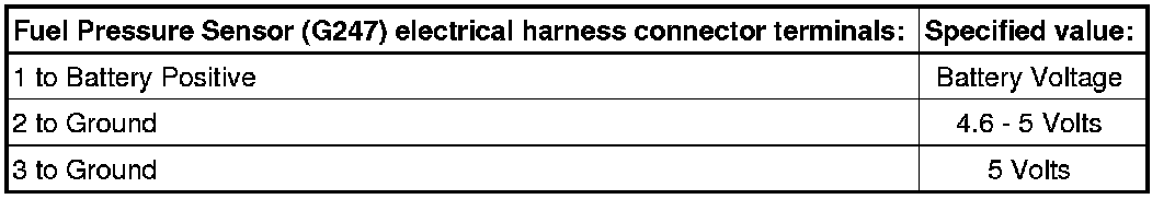 - Using a multimeter, check the Fuel Pressure Sensor (G247) view electrical harness connector terminals for voltage.