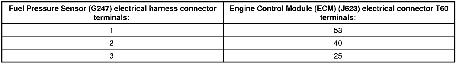 - Using a multimeter, check the Fuel Pressure Sensor (G247) electrical harness connector terminals to the Engine Control Module (ECM) (J623) electrical harness connector T60 terminals for an open circuit. Refer to Wiring Diagrams for Pin locations.