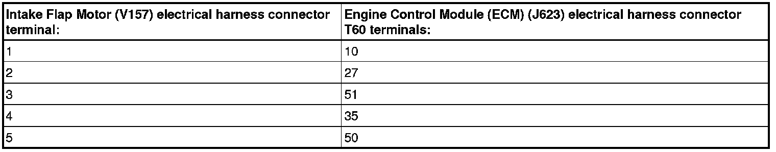 - Using a multimeter, check the Intake Flap Motor (V157) electrical harness connector to the Engine Control Module (ECM) (J623) electrical harness T60 connector for resistance. Refer to Wiring Diagrams for Pin locations.
