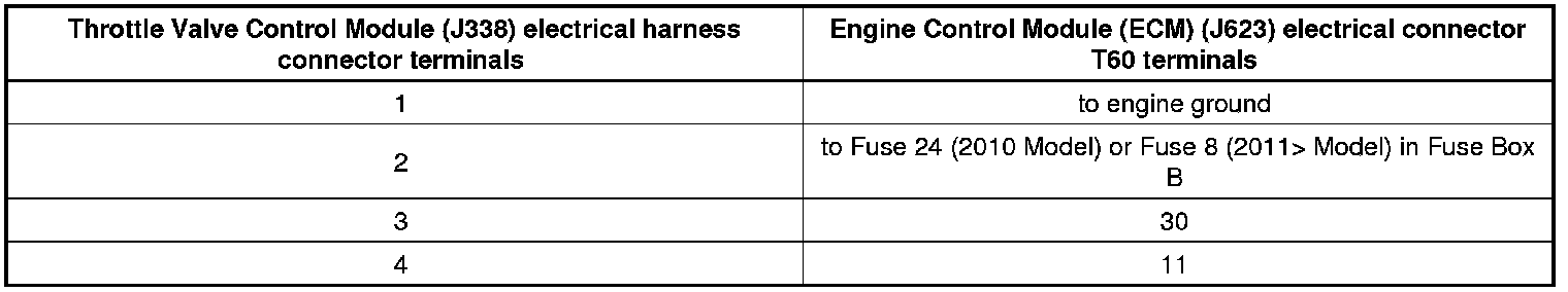 - Using a multimeter, measure the voltage between terminal 1 and 4 of the Throttle Valve Control Module (J338) electrical harness connector.