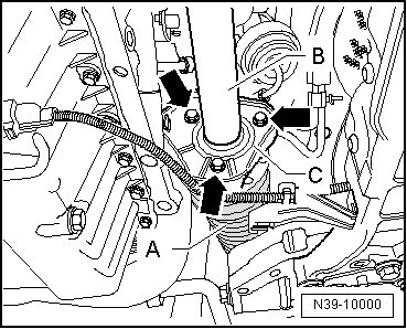 - After removing the right drive axle - A -, remove the intermediate shaft - B - from the bracket - C - - arrows - and from the transmission stub shaft.