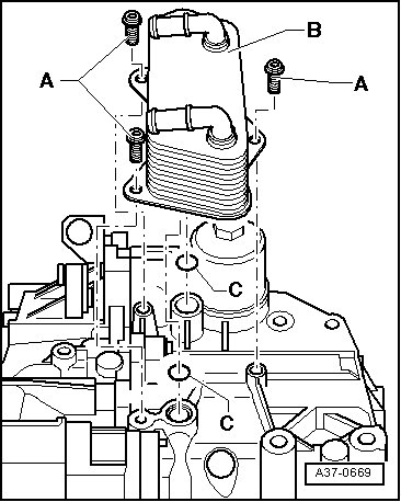 - Install the transmission oil cooler - B -, while doing this, pay attention to the O-rings - C -.