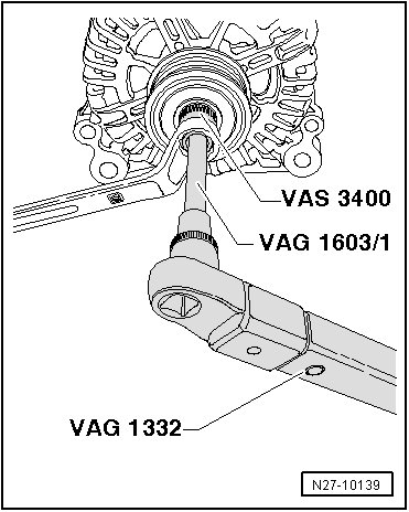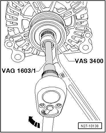 - Insert (VAS 3400) into ribbed belt pulley with freewheel of generator using open end wrench 17 mm.