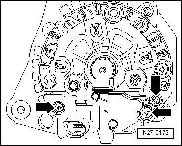 - Remove mounting bolts of voltage regulator - arrows - (2 Nm).