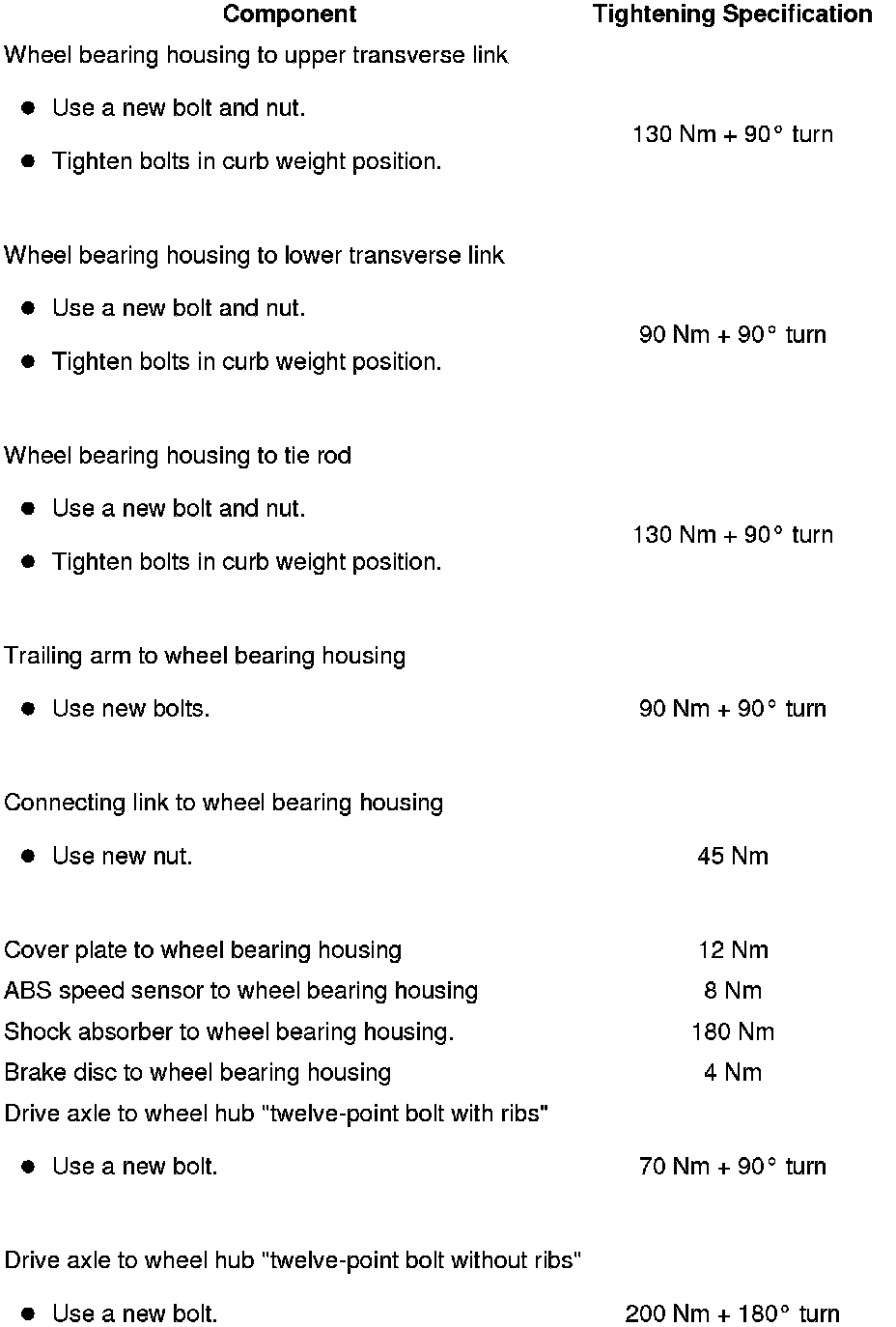 Bolting at wheel bearing housing may occur only when the dimension between wheel hub center and lower edge of wheel house, has been attained. Refer to => [ Before lifting the axle on one side, the vehicle must be secured on both sides to the lift arms of the lift using. ] Rear Axle, Lifting to Curb Weight Position.