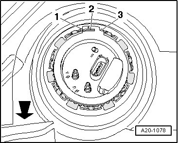 • The tab - 2 - on the flange must lie between the tabs - 1 and 3 - on the fuel tank.