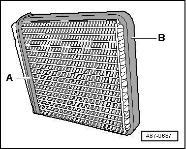 - Inspect the seals - A - and - B - attached on the heater core. Only install the heater core if the seals are not damaged.