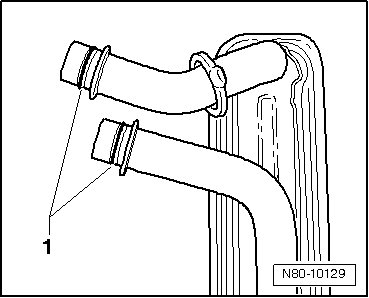 - Loosen the bolt - 1 - on the connection flange between the heater core connections, but do not remove it.