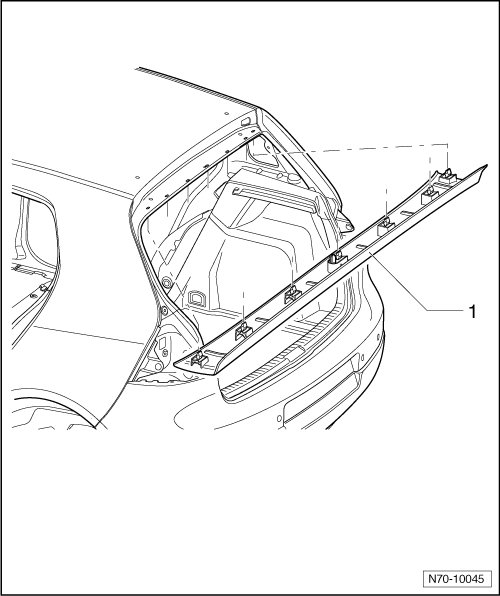- Remove roof end strip - 1 - down out of mounts in roof crossmember and rear lid seal molding.