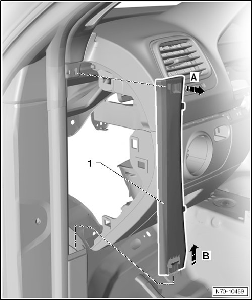 - Pull trim upward out of lower A-pillar trim - arrow B -.