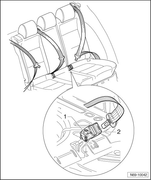 - Remove screw - 1 - (40 Nm) and remove double seat belt latch - 2 - from body.