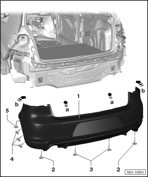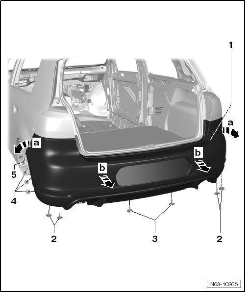 - Remove the rear bumper cover - 1 - parallel from the vehicle - arrows b -.