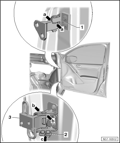 - Lubricate the lower door hinge - 3 - with Grease (G 000 150) all the way around - arrows a - on the pin and hole.