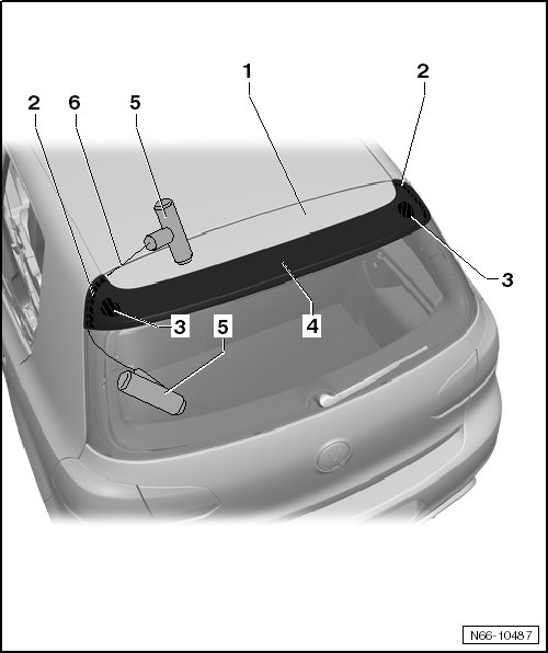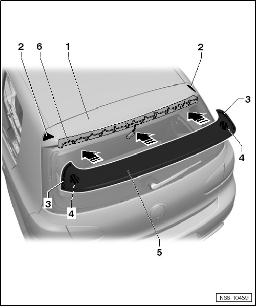 - Align roof edge spoiler - 5 - to rear lid - 1 - and press roof edge spoiler into catch on retaining strip.