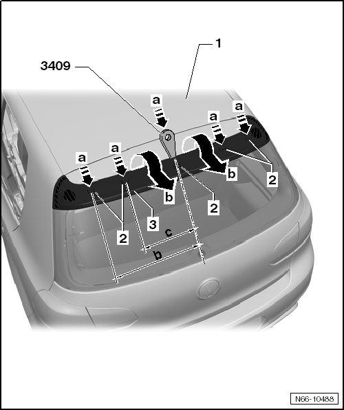 - Insert several Removal Wedge (3409) between the rear lid - 1 - and spoiler on the edge of the roof - arrows a - until all the hooks - 2 - have been disengaged. A clear and definite click must be heard.